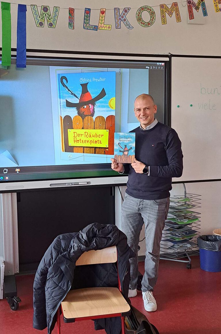 Auch der Landtagsabgeordnete Florian Bellaire kehrte zum Vorlesetag in seine ehemalige Grundschule zurück. Vor den Schülerinnen und Schülern der 1. Klasse las er aus dem Kinderbuchklassiker:“ Räuber Hotzenplotz“ vor.