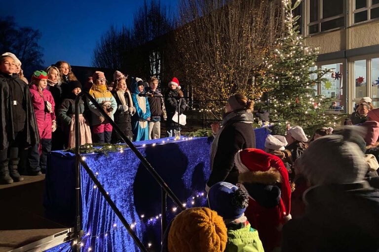 Für die richtige Stimmung sorgten unsere beiden Hausmeister, die den Pausenhof mit einer liebevollen und strahlenden Weihnachtsbeleuchtung und passender Musik in ein funkelndes Winterdorf verwandelten. Heizpilze und viele dekorative Elemente machten die minus drei Grad nicht nur erträglich, sondern sogar noch ein kleines bisschen magischer.